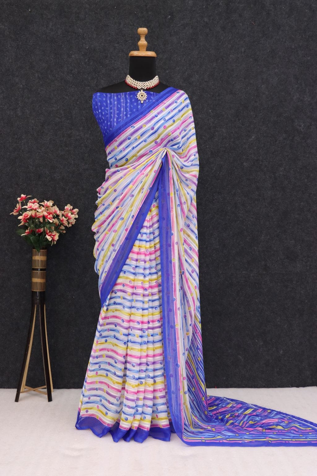 Add timeless elegance to your wardrobe with this stunning Georgette Kaveri Saree. Crafted from premium-quality georgette fabric, this saree is designed to provide you with a perfect drape, airy comfort, and graceful fall.